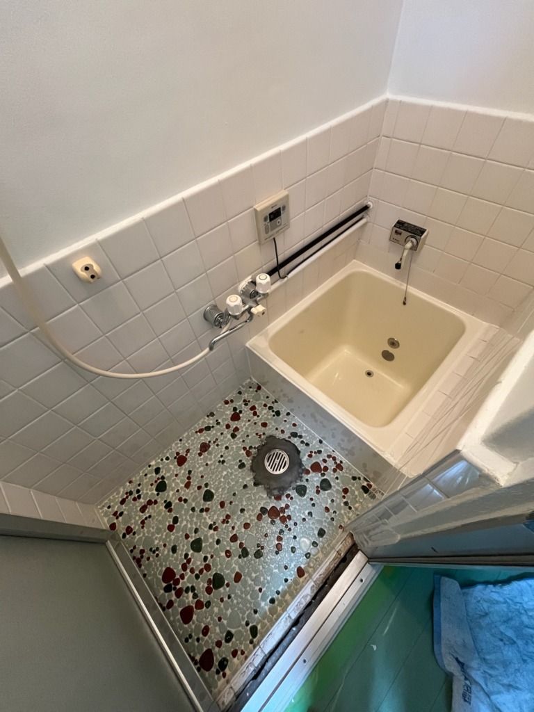 築年数の経った浴室で、変色した青色のFRP浴槽と、劣化が目立つエプロンパネルにお悩みのお客様からご相談をいただきました。