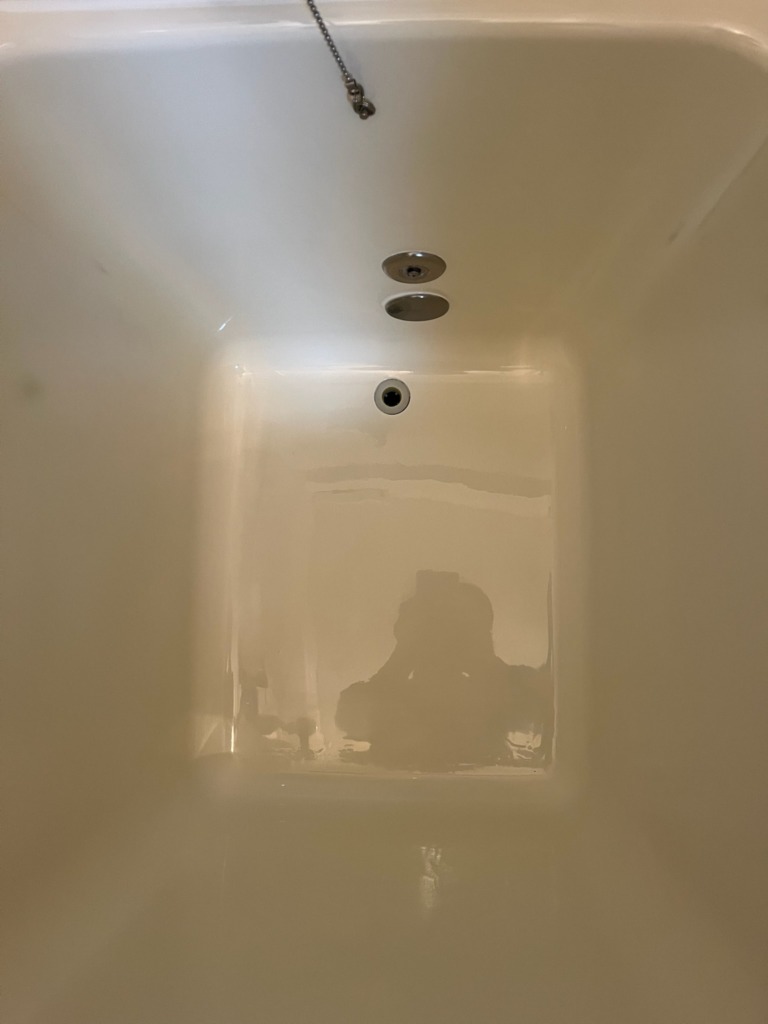 まずはFRP浴槽を専用下地処理でしっかりと研磨・洗浄し、密着性の高いプライマーを塗布。その上から、落ち着きと清潔感のあるアイボリー系の塗料で仕上げました。底面は、まるで鏡のように影が映り込むほどの光沢がよみがえり、「新品みたい」と大変喜んでいただけました。エプロン部分は既存の上から新しいパネルを上張りし、継ぎ目や段差が目立たないよう細部まで調整。既存の浴槽とのバランスも考慮し、違和感のない自然な仕上がりになりました。
