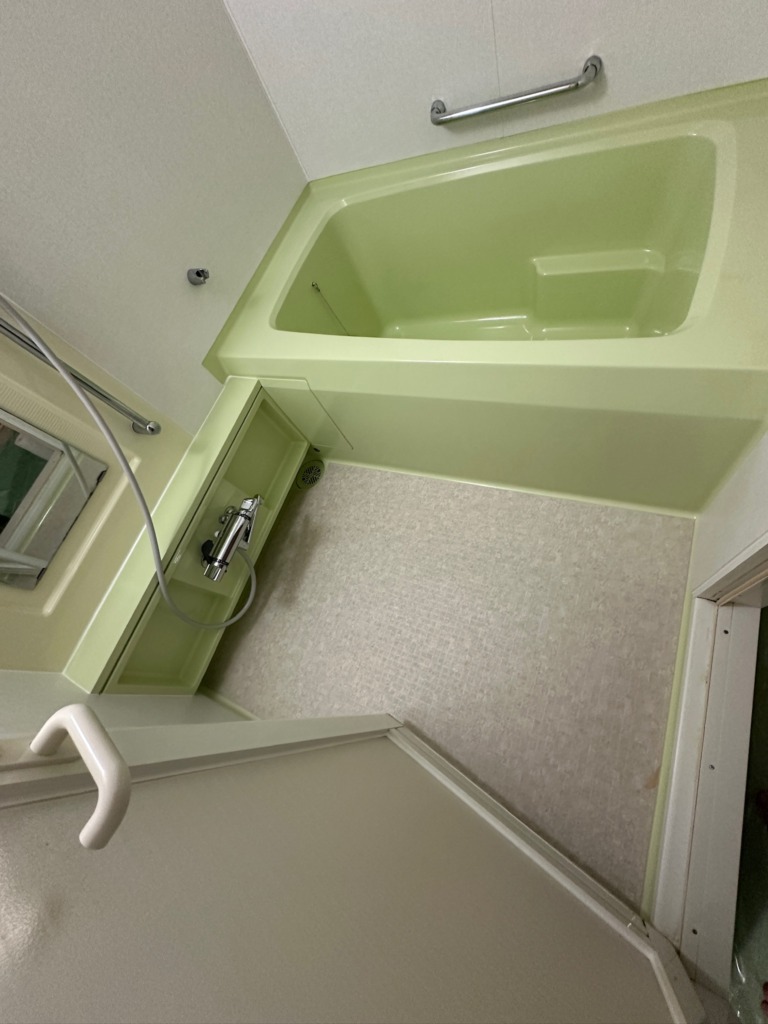 浴槽の微細なクラックについては、FRPライニングによる補修を行い、その後、深みのあるグリーンで塗装。見た目のリフレッシュだけでなく、耐久性の向上も実現しています。さらに、鏡付き収納棚はも浴槽よりワントーン薄いグリーンで仕上げ、空間全体に統一感をもたせました。